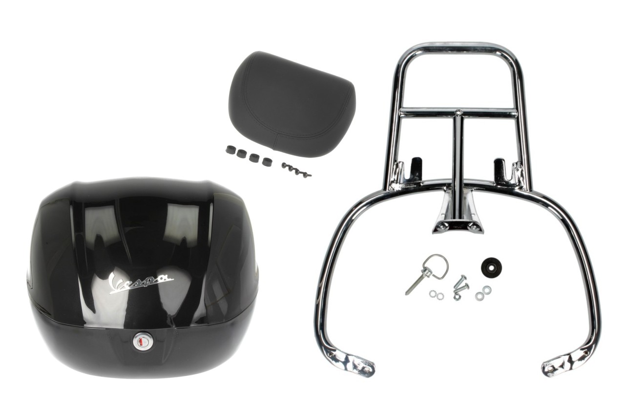 Kit bauletto 32L nero cosmo (98/A), cuscino posteriore nero per Vespa Primavera